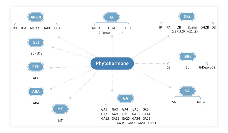 | 1 | 赤霉素(GA1、GA3、GA4、GA5、GA6、GA7、GA8、GA9、GA13、GA14、GA15、GA19、GA20、GA24、GA29、GA34、GA44、GA51、GA53) | / | 外标法 同位素内标法 | 植物鲜样/种子 |