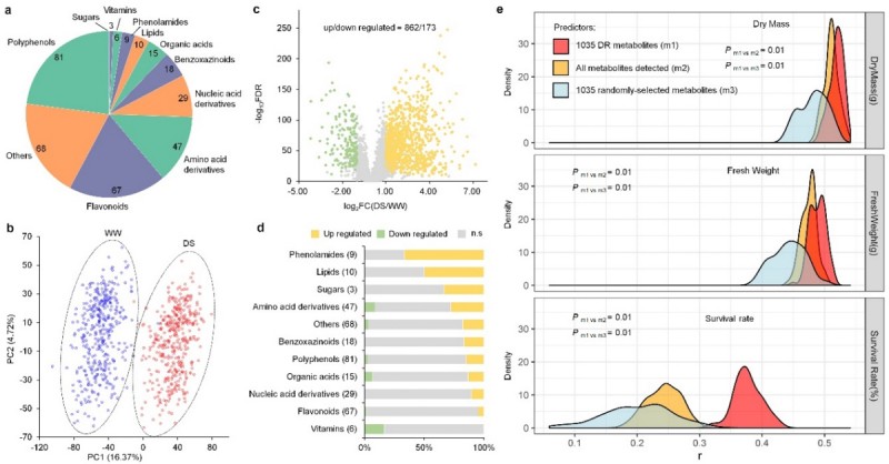 图1 干旱响应特异代谢物具有更优秀的抗旱性预测能力。a 鉴定到的已知结构的代谢物分类;b 正常浇水和干旱条件下,玉米群体基于代谢物的PC分析;c 上调和下调表达的代谢物;d 已知结构的干旱响应代谢物;e 代谢物对抗旱表型指数的预测