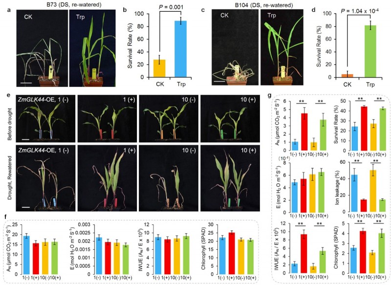 图3 ZmGLK44的抗旱功能解析。a-d 外施色氨酸促进玉米抗旱;e-g ZmGLK44诱导表达促进植物抗旱,提高干旱条件下的水分利用效率。